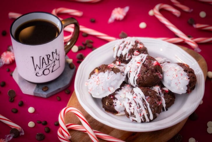 They’re also really versatile. You can sprinkle the crushed peppermint before baking for a subtle crunch, and drizzle them with white chocolate and add extra peppermint for a stunning bakery-style finish. Plus, the dough holds up beautifully in the fridge or freezer, so you can prep ahead and bake ’em up whenever you need them! Yum.